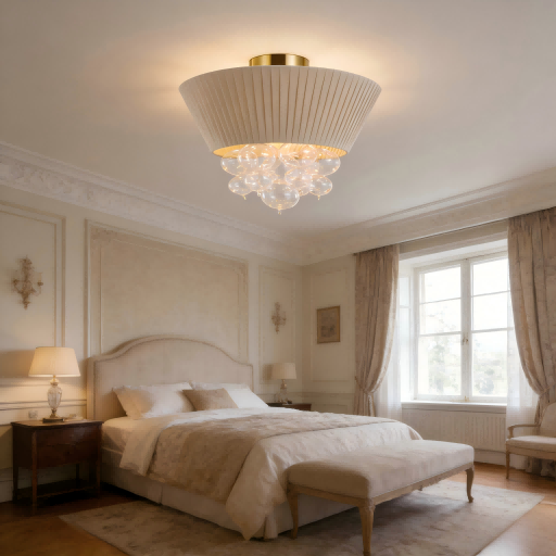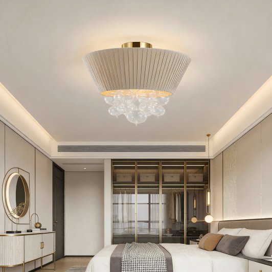 Au cours de son service à long terme sur les marchés européens et américains, Strong Lighting a toujours accordé une attention particulière aux besoins esthétiques et aux scénarios d'utilisation des utilisateurs finaux. L'abat-jour en tissu de ce plafonnier est réalisé avec des techniques de texture pressées à la main, créant une texture plissée naturelle et tridimensionnelle. La lumière qu'elle émet est douce et uniformément répartie, créant un environnement lumineux chaleureux et confortable. Les bulles de verre suspendues en dessous sont soufflées à la bouche, chacune ayant une forme légèrement différente. Lorsqu'elles sont allumées, elles ressemblent à des perles lumineuses suspendues, présentant un effet d'ombre et de lumière dynamique et charmant. Qu'il soit utilisé dans un espace résidentiel minimaliste nordique ou dans un lieu commercial au style luxueux et léger, il peut améliorer considérablement la qualité de l'espace.